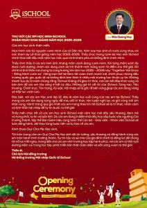 Nhân dịp khai giảng năm học 2025-2026, Thầy Đào Quang Huy – Chủ tịch Hội đồng trường Hệ thống trường iSchool đã gửi gắm những lời chúc và thông điệp đầy cảm hứng đến toàn thể học sinh, quý thầy cô và phụ huynh.