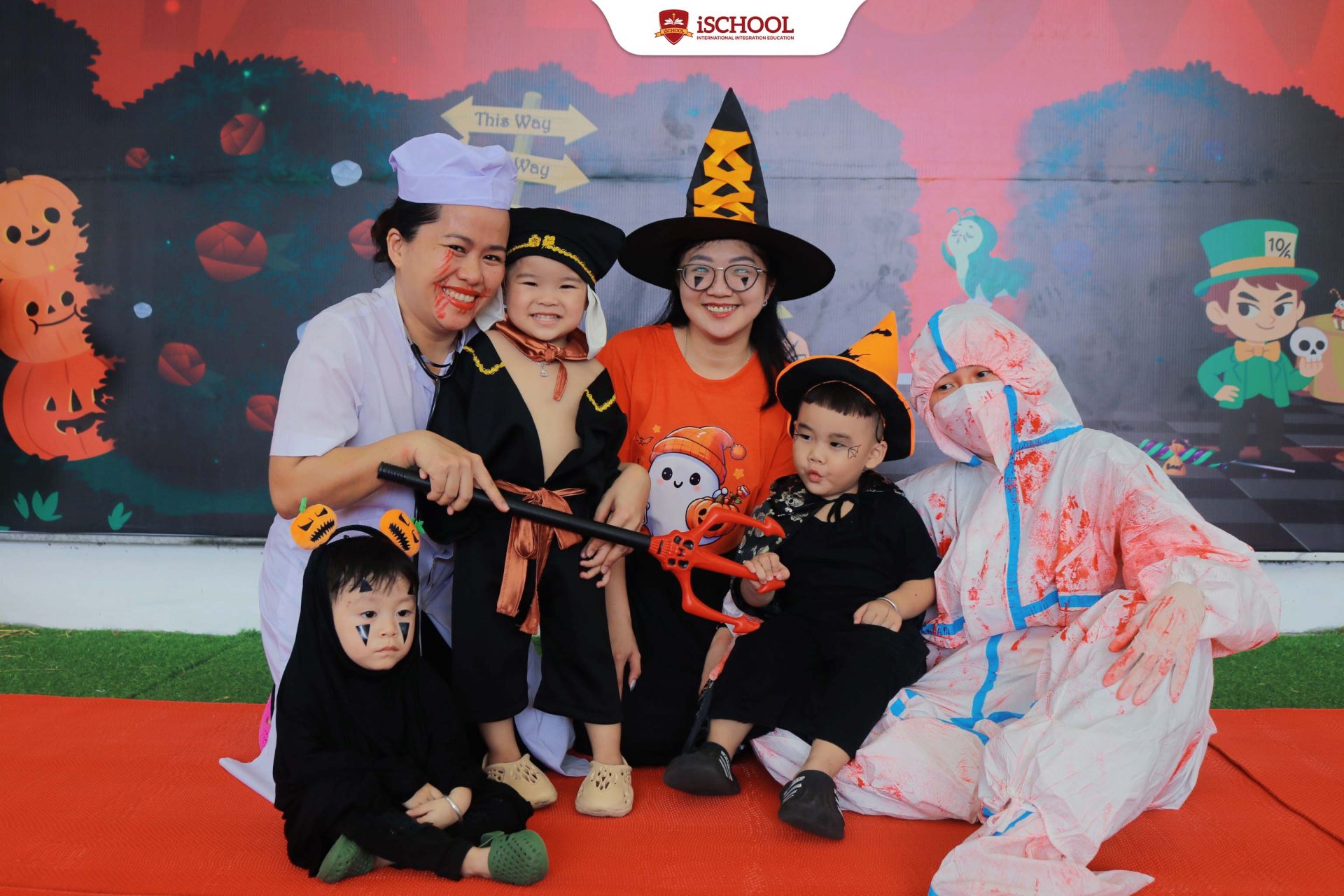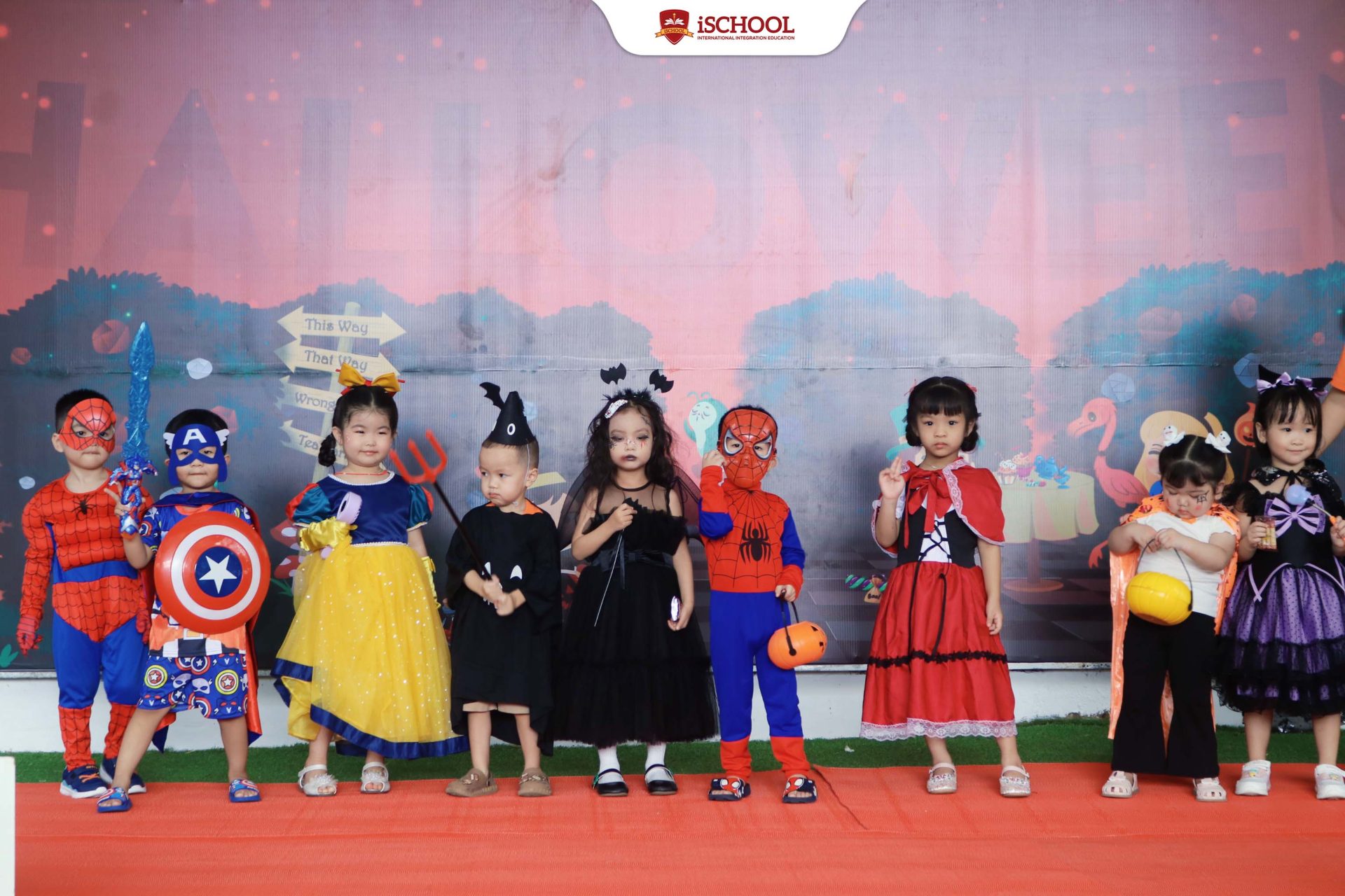Ngay từ sáng sớm,sân trường đã trở nên lung linh và huyền bí với những góc trang trí đầy màu sắc. Các bé háo hức hóa trang thành nhiều nhân vật dễ thương và ngộ nghĩnh như phù thủy nhỏ, công chúa, quả bí, siêu nhân,… tạo nên một bức tranh Halloween vừa kỳ bí vừa đáng yêu. 🎭