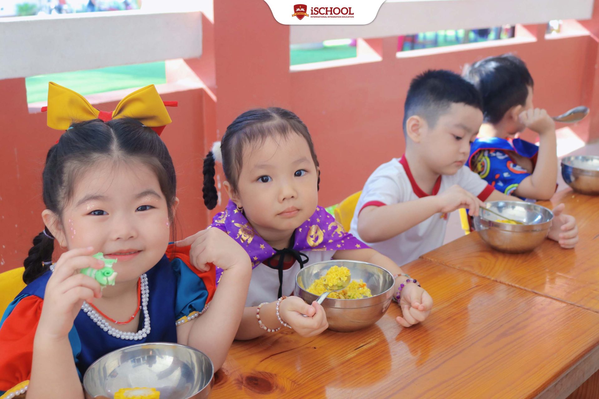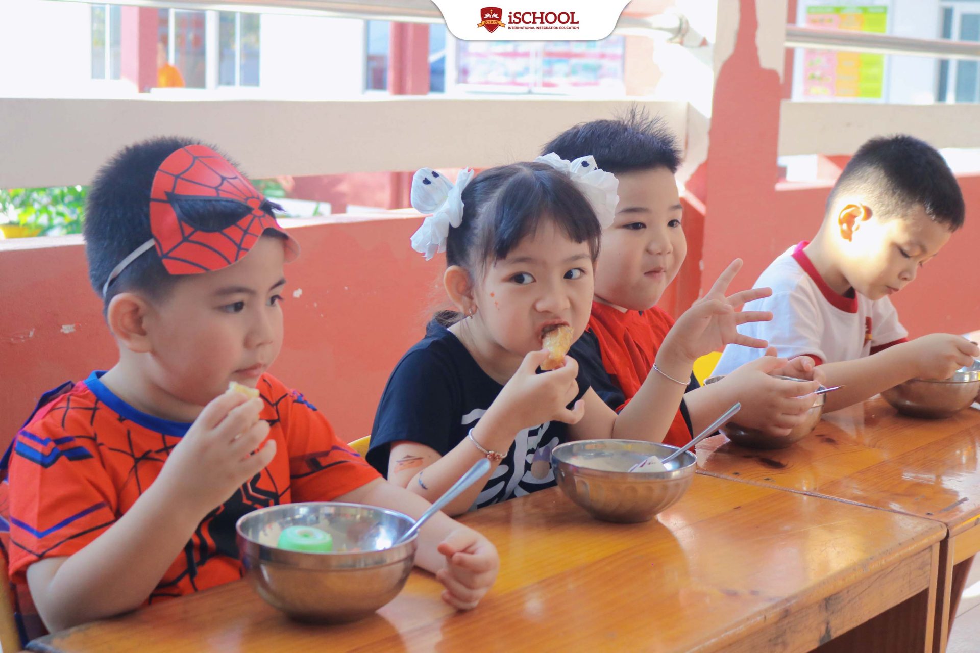 Sau phần hóa trang, các bé cùng nhau thưởng thức tiệc sáng tự chọn với nhiều món ăn hấp dẫn, dinh dưỡng và hợp khẩu vị. Không khí vui tươi, tiếng cười rộn rã khiến bữa tiệc trở nên ấm áp và đầy ý nghĩa. 🍇🥪🥛