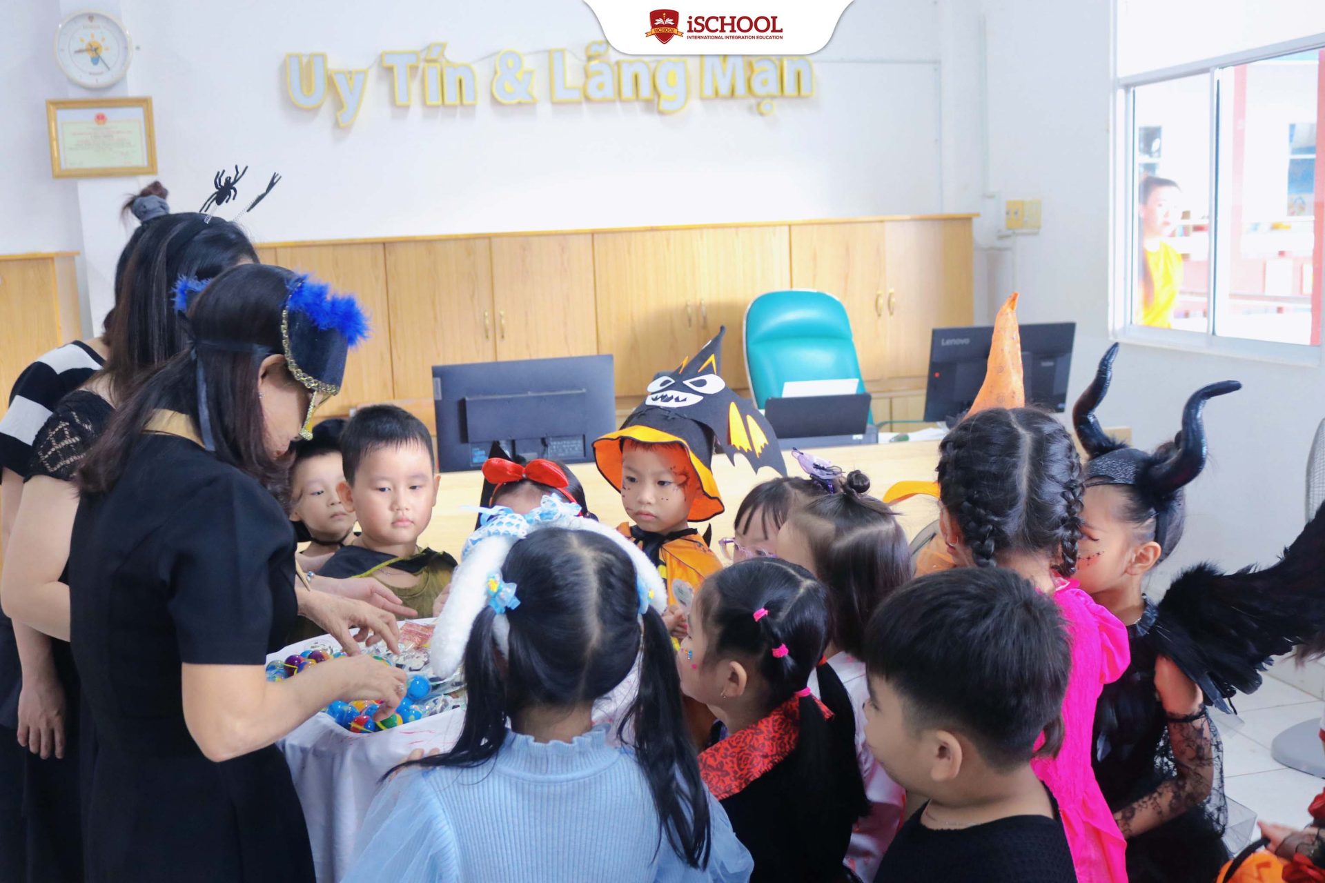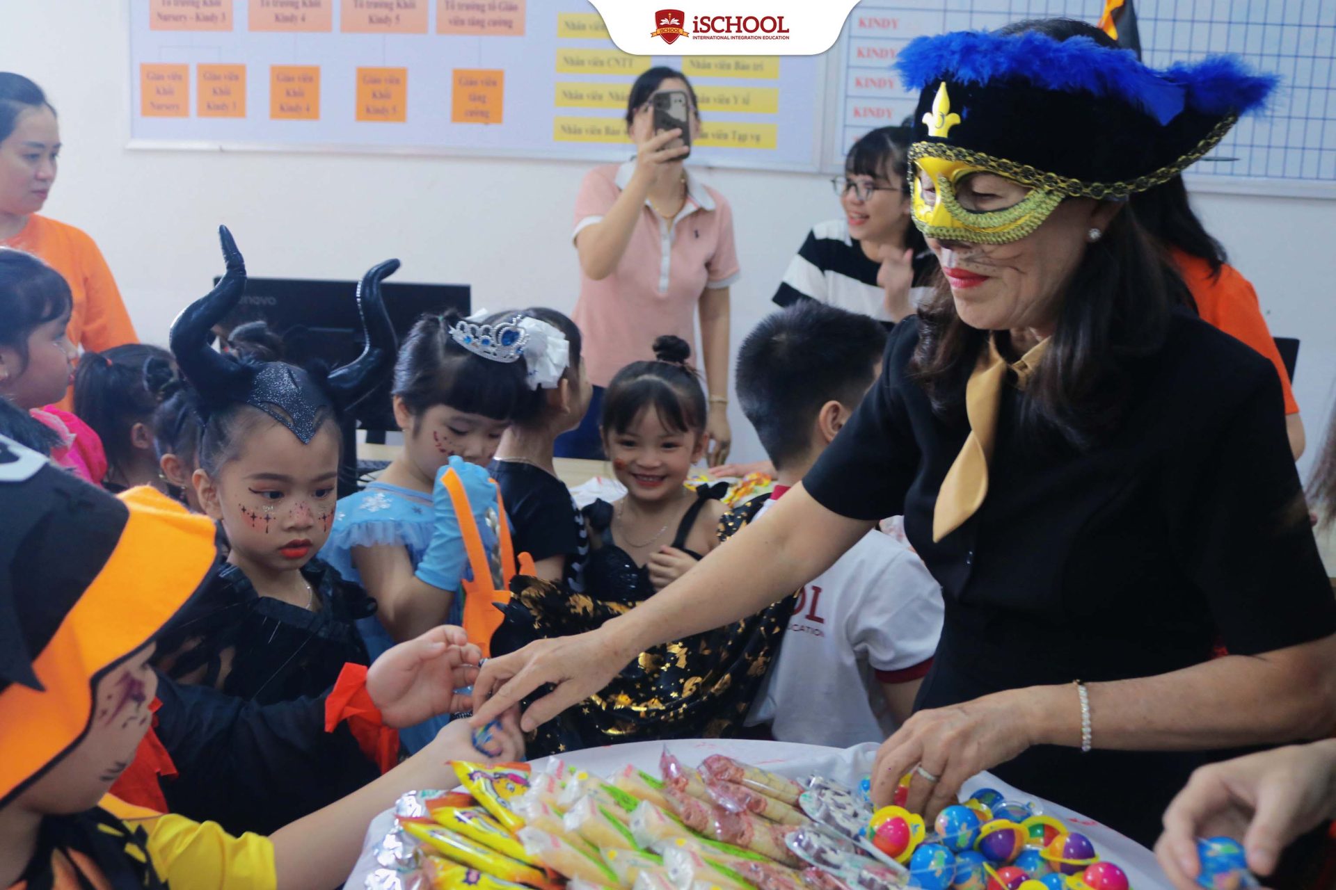 Phần được mong chờ nhất chính là hoạt động “Trick or Treat – Đi xin kẹo”. Những giỏ kẹo đầy ắp là phần thưởng ngọt ngào mà các bé nhận được sau khi cùng bạn bè đi gõ cửa từng lớp học, mang về bao niềm vui và hứng khởi. 🍬👻