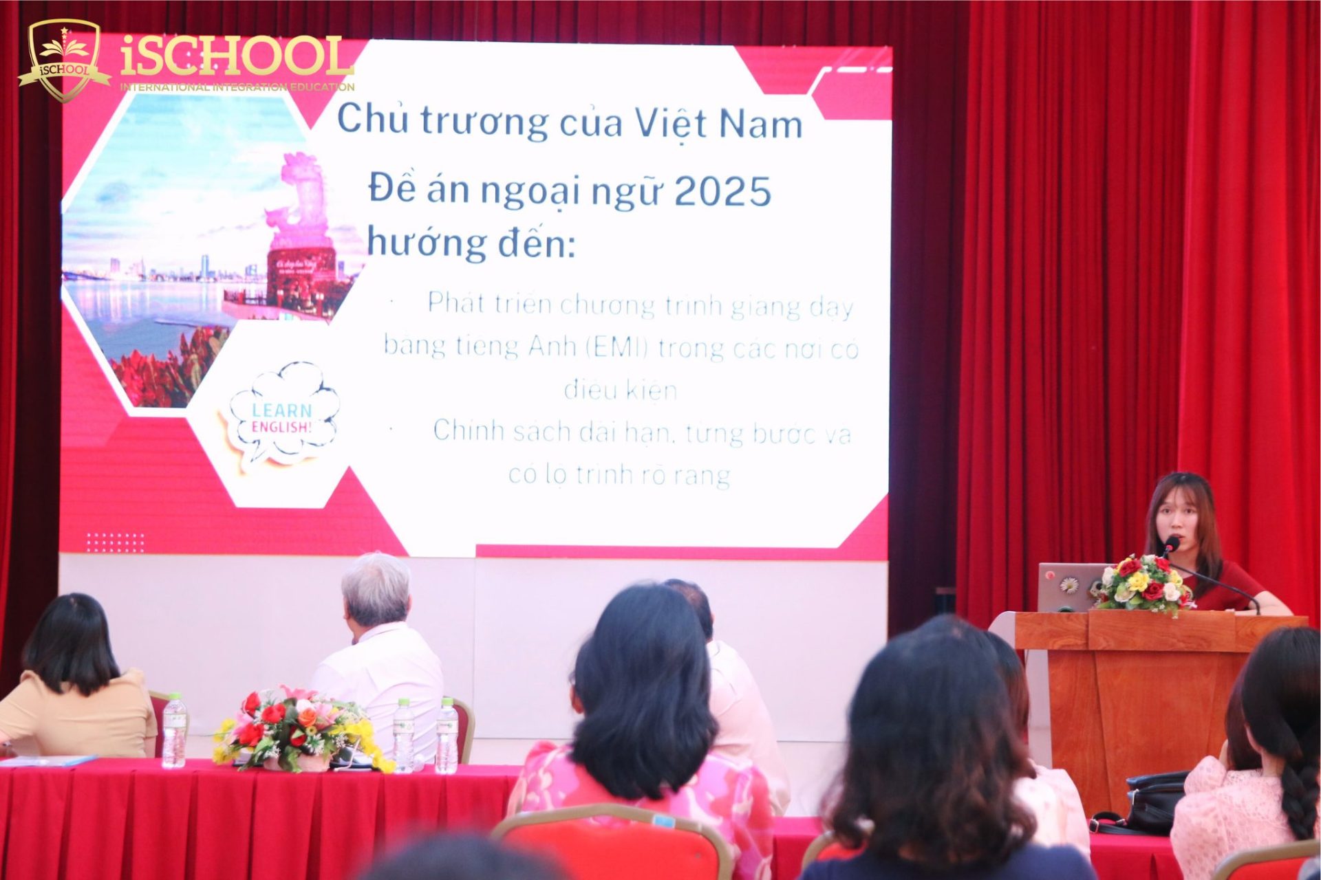 - Tổ Tiếng Anh chia sẻ tham luận sôi nổi mang tên “Nâng cao chất lượng môn Tiếng Anh”, do cô Bùi Nguyễn Minh Thuyên và cô Võ Đoàn Ngọc Hiếu trình bày. Tham luận tập trung vào những giải pháp thực tiễn, giúp học sinh rèn luyện kỹ năng ngôn ngữ toàn diện, đáp ứng chuẩn đầu ra quốc tế.