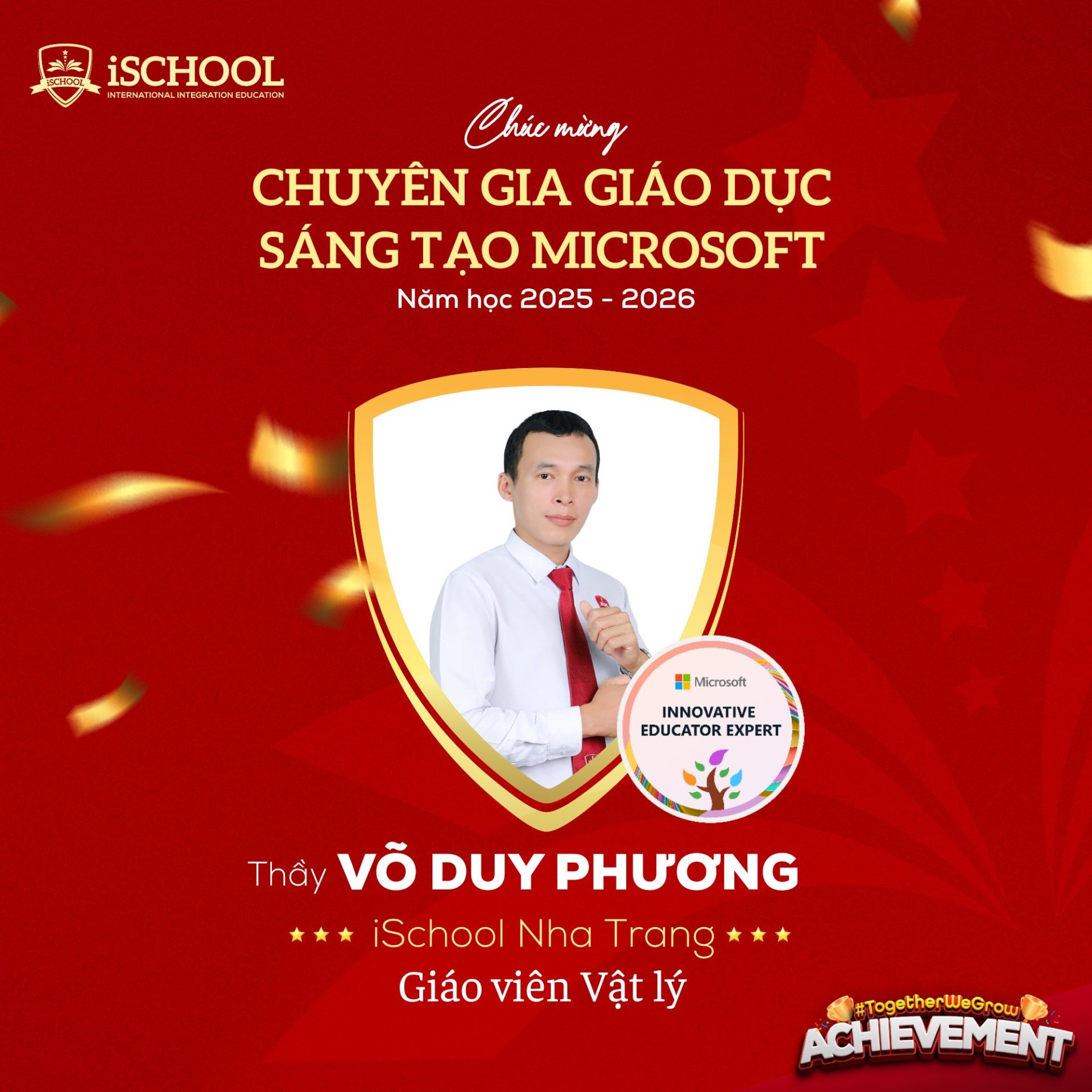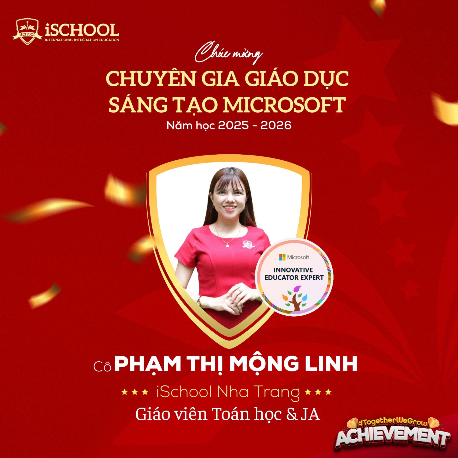 Trong hành trình đổi mới và hội nhập giáo dục toàn cầu, Trường Hội nhập Quốc tế iSchool Nha Trang tự hào ghi dấu với thành tích nổi bật khi có 04 giáo viên xuất sắc được công nhận là Chuyên gia Giáo dục Sáng tạo Microsoft – Microsoft Innovative Educator Expert (MIEE). Đây là danh hiệu quốc tế uy tín dành cho những nhà giáo tiên phong, luôn đi đầu trong ứng dụng công nghệ và sáng tạo nhằm nâng cao chất lượng dạy học.