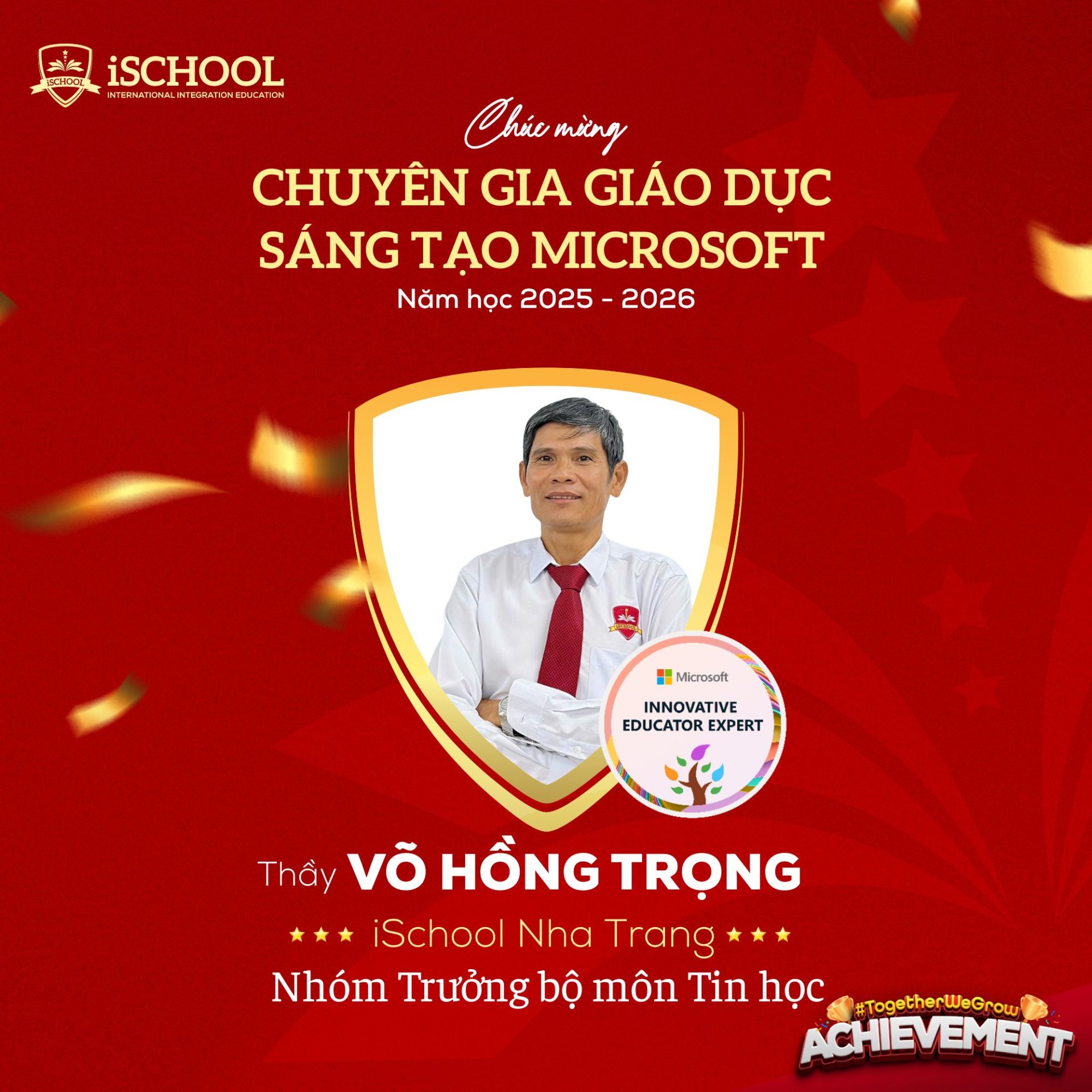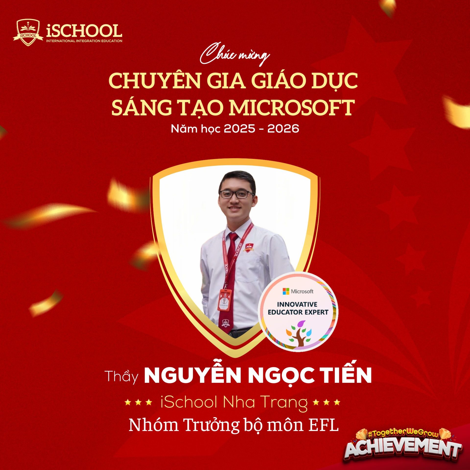 Một lần nữa, xin chúc mừng 04 giáo viên iSchool Nha Trang đã xuất sắc trở thành Chuyên gia Giáo dục Sáng tạo Microsoft (MIEE). Thành tích này không chỉ là niềm tự hào của nhà trường, mà còn là bước tiến quan trọng trên con đường khẳng định chất lượng và thương hiệu giáo dục iSchool trong cộng đồng giáo dục quốc tế.
