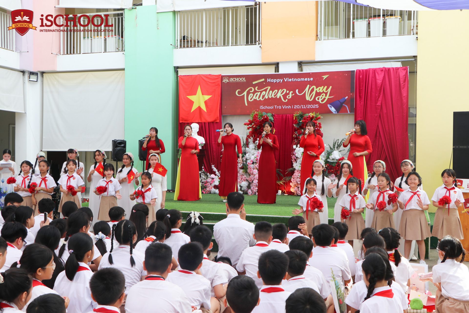 Ngay từ sáng sớm, sân trường iSchool Trà Vinh đã rộn ràng sắc đỏ truyền thống. Thầy cô rạng rỡ trong tà áo dài và đồng phục trang nghiêm, các em học sinh háo hức chuẩn bị những tiết mục văn nghệ đặc sắc, những bó hoa tươi thắm và những lời chúc chân thành dành tặng thầy cô – những người đồng hành tận tụy mỗi ngày.